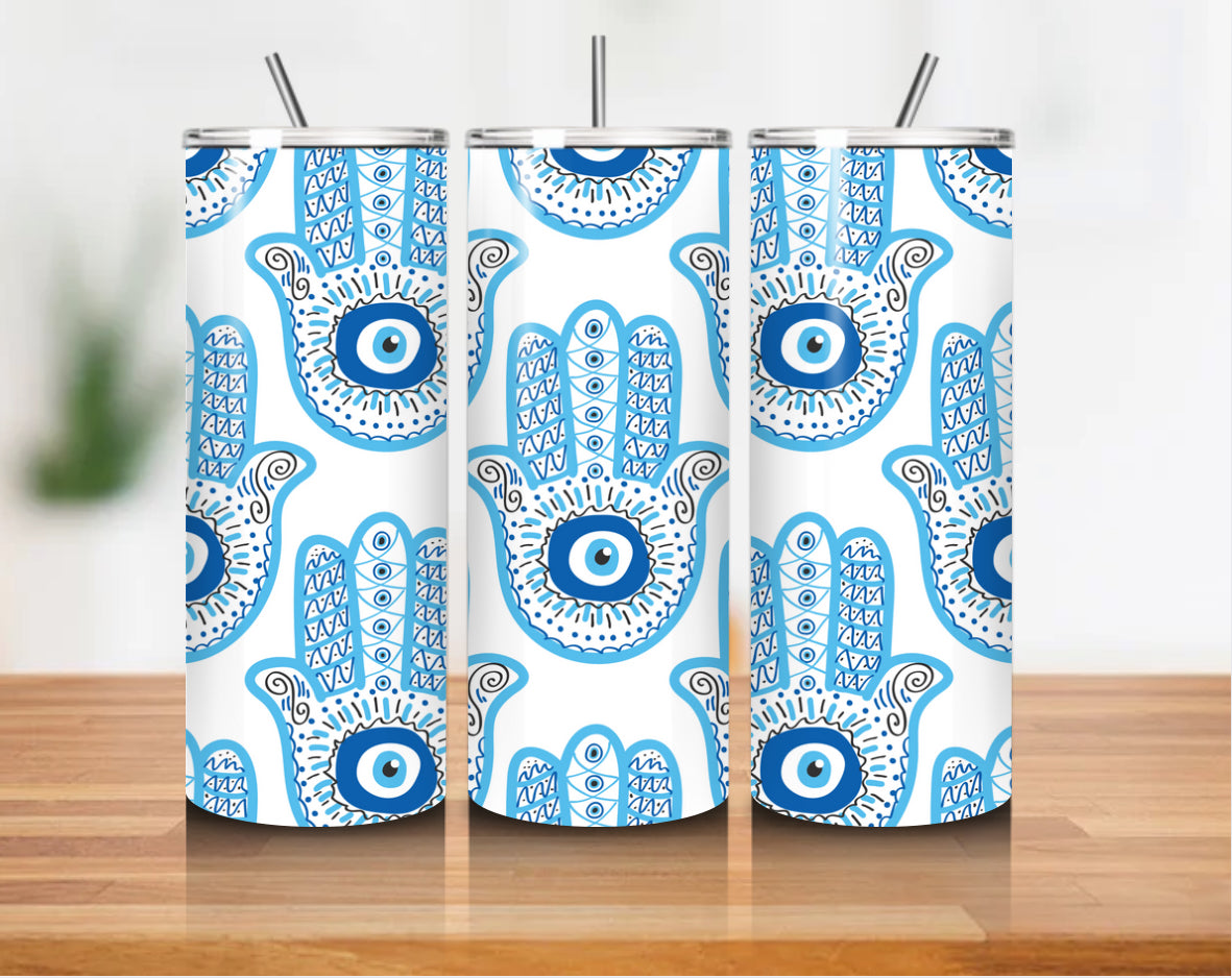 Repeating Hamsa Evil Eye Pattern wrapped around a 20oz stainless steel cup with a clean, glossy finish.