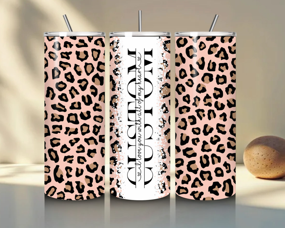 Pink leopard print tumbler with soft tones for a cute aesthetic. This 20oz tumbler is fully customised with your chosen name and centre text, made for everyday shine.
