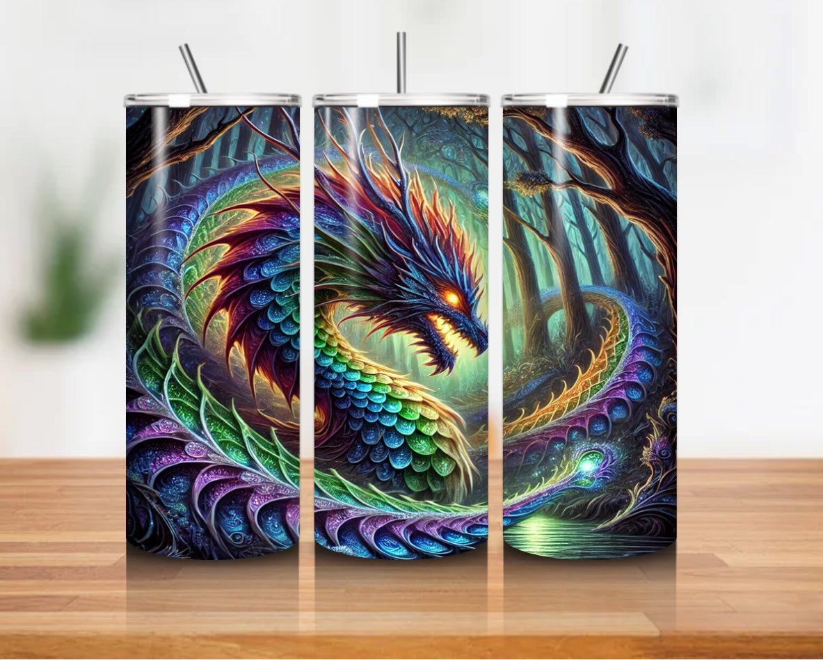 Rainbow Forest Dragon wrapped around a 20oz stainless steel cup with a clean, glossy finish.