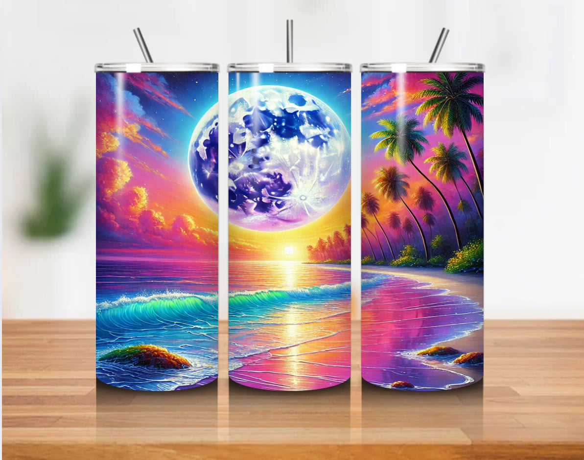 Cosmic Beach Moonrise wrapped around a 20oz stainless steel cup with a clean, glossy finish.
