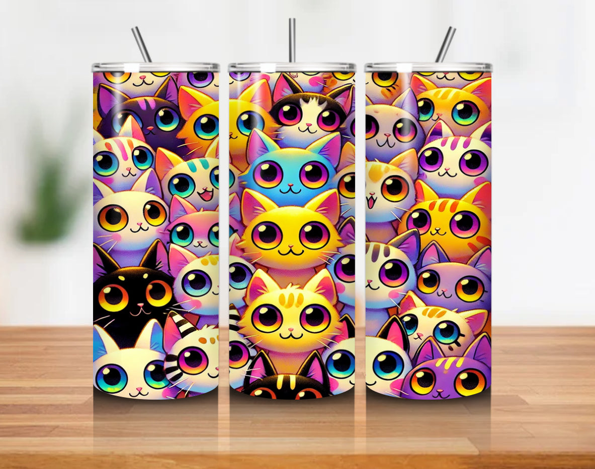 Kawaii Cat Crowd wrapped around a 20oz stainless steel cup with a clean, glossy finish.