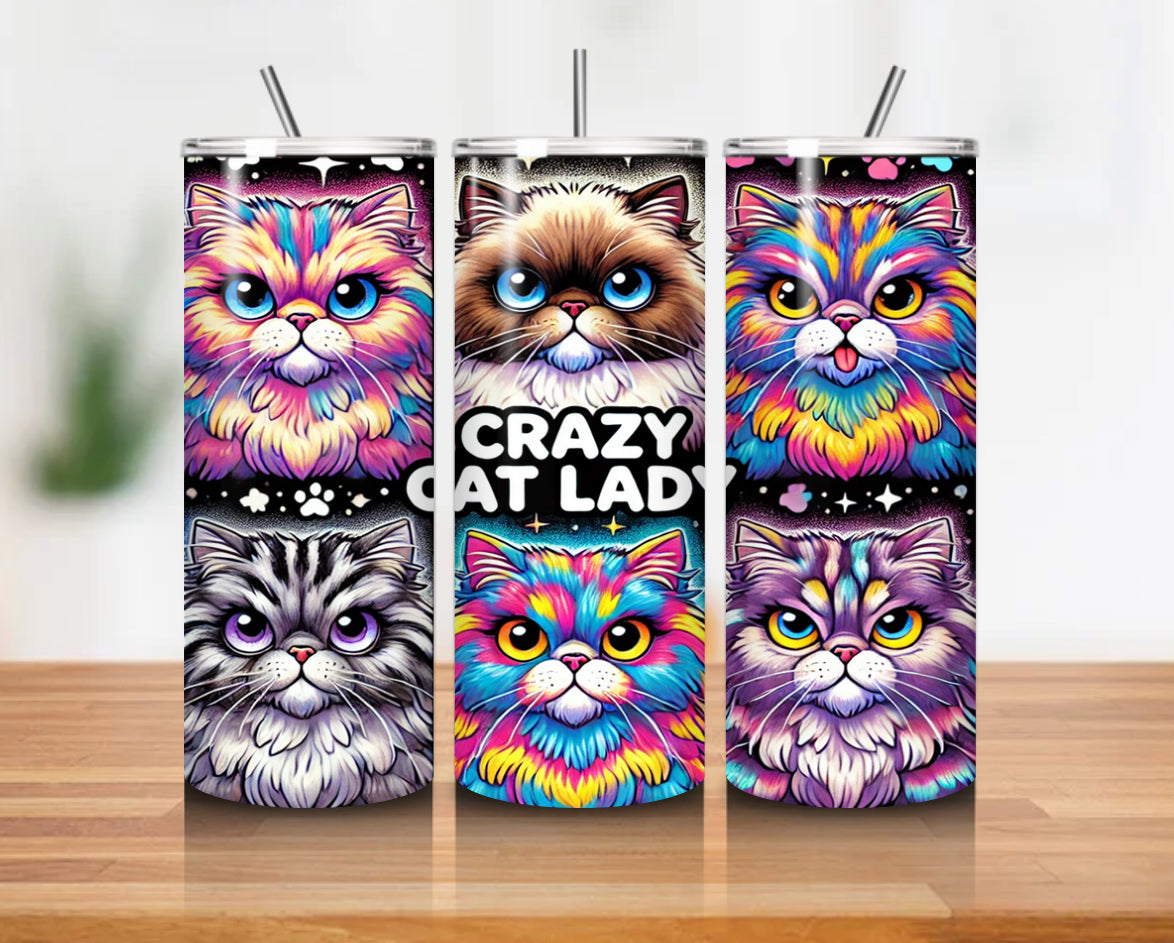 Crazy Cat Lady Vibes wrapped around a 20oz stainless steel cup with a clean, glossy finish.