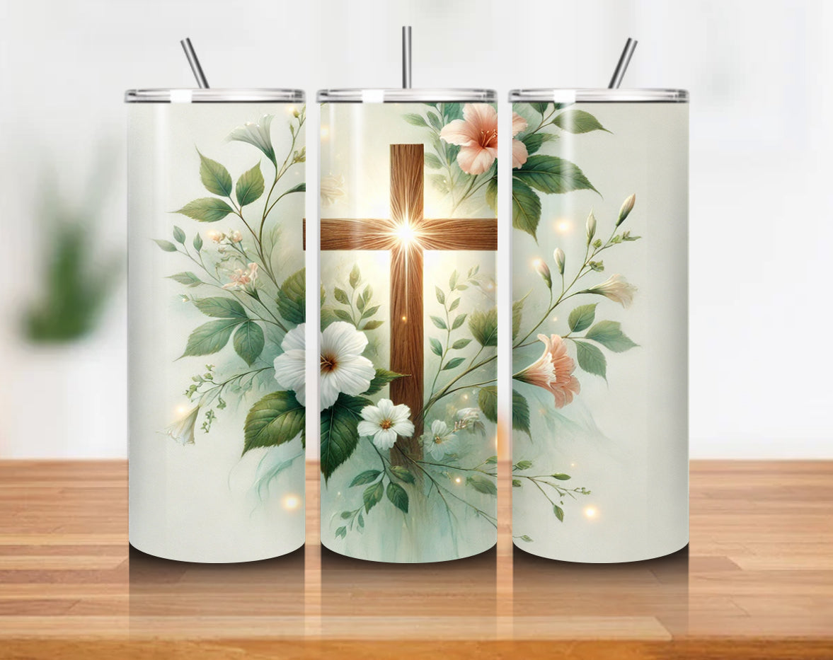 Floral Cross Grace wrapped around a 20oz stainless steel cup with a clean, glossy finish.