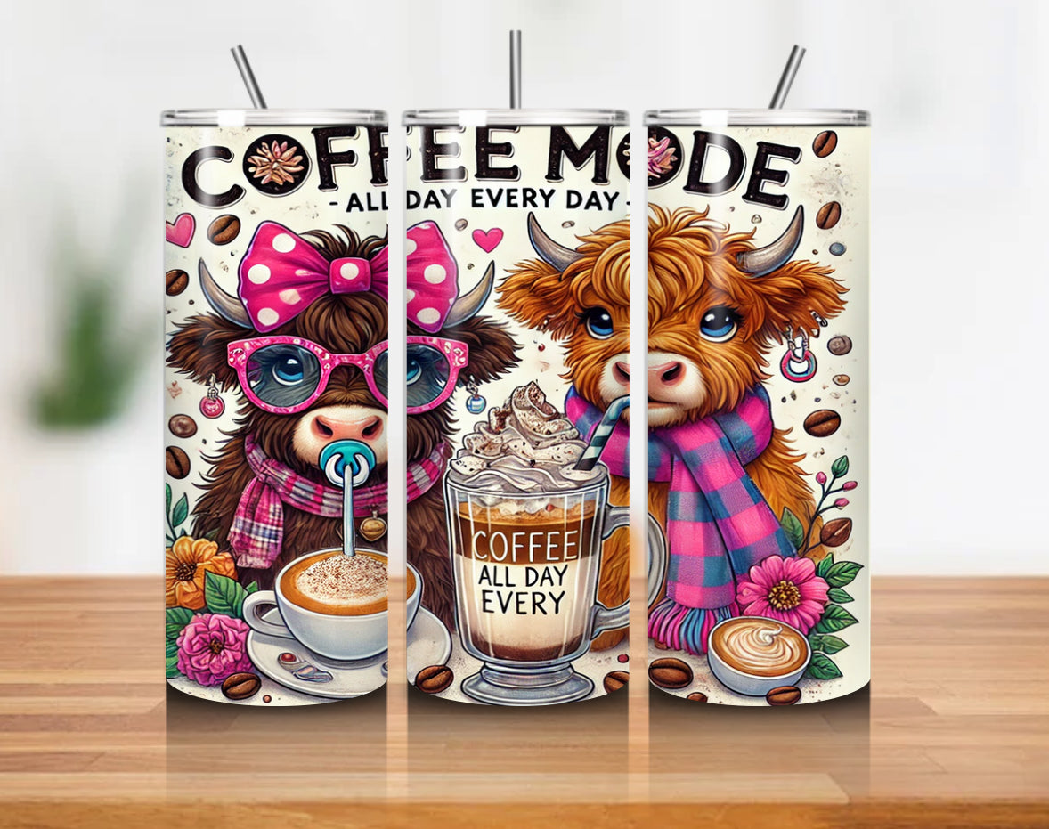 Coffee Mode Cows wrapped around a 20oz stainless steel cup with a clean, glossy finish.