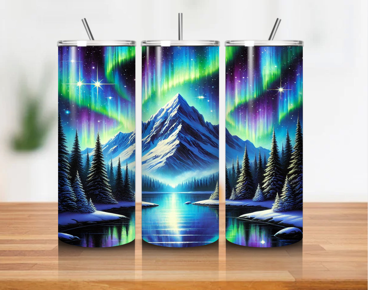 Northern Lights Majesty wrapped around a 20oz stainless steel cup with a clean, glossy finish.