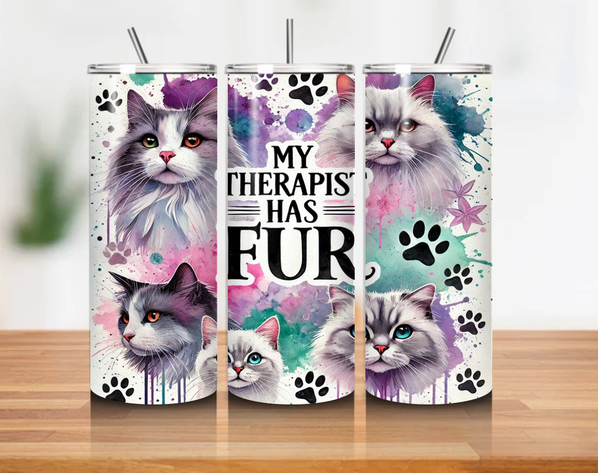 My Therapist Has Fur wrapped around a 20oz stainless steel cup with a clean, glossy finish.