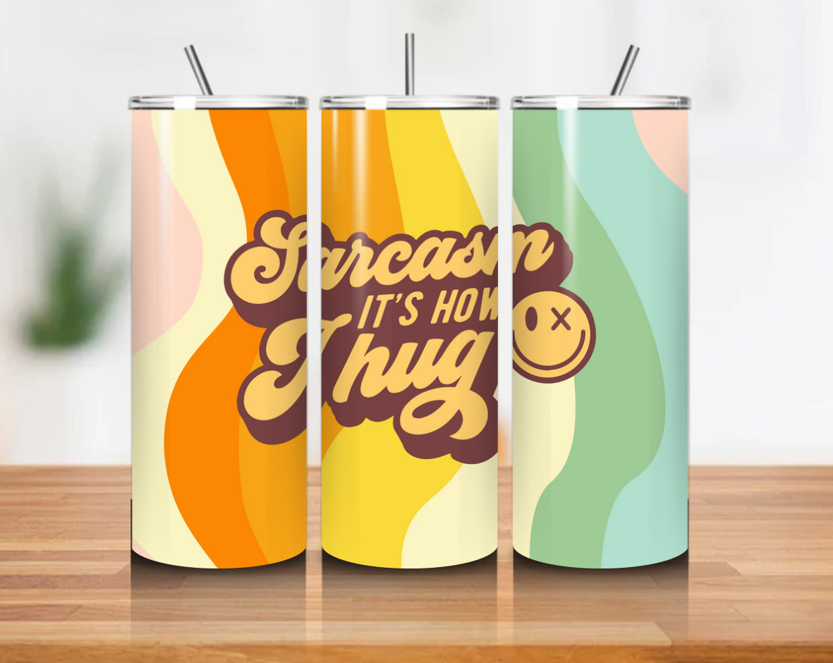 Sarcasm It’s How I Hug wrapped around a 20oz stainless steel cup with a clean, glossy finish.