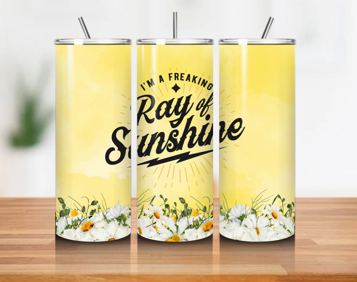 I’m a Freaking Ray of Sunshine wrapped around a 20oz stainless steel cup with a clean, glossy finish.