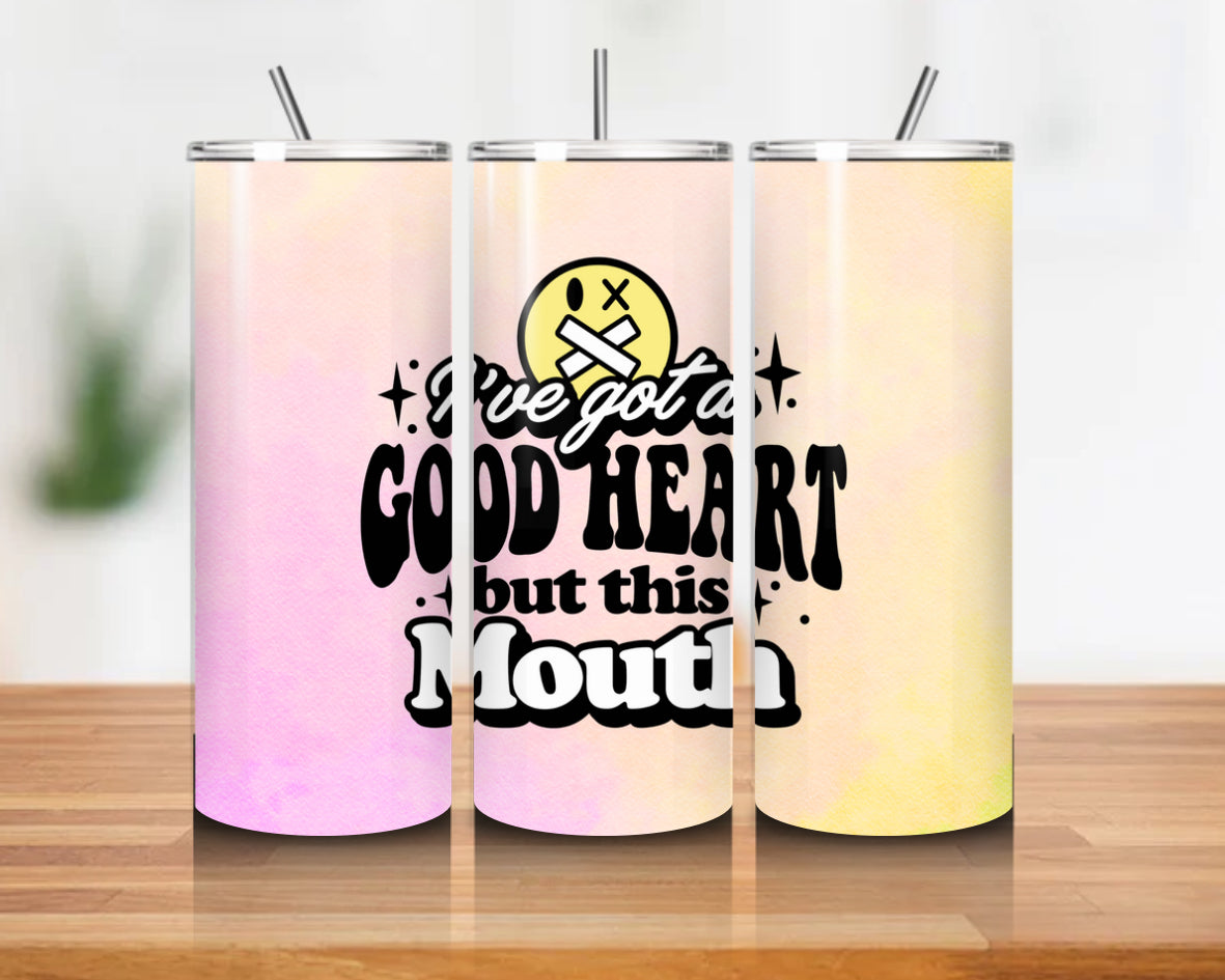 Good Heart But This Mouth wrapped around a 20oz stainless steel cup with a clean, glossy finish.