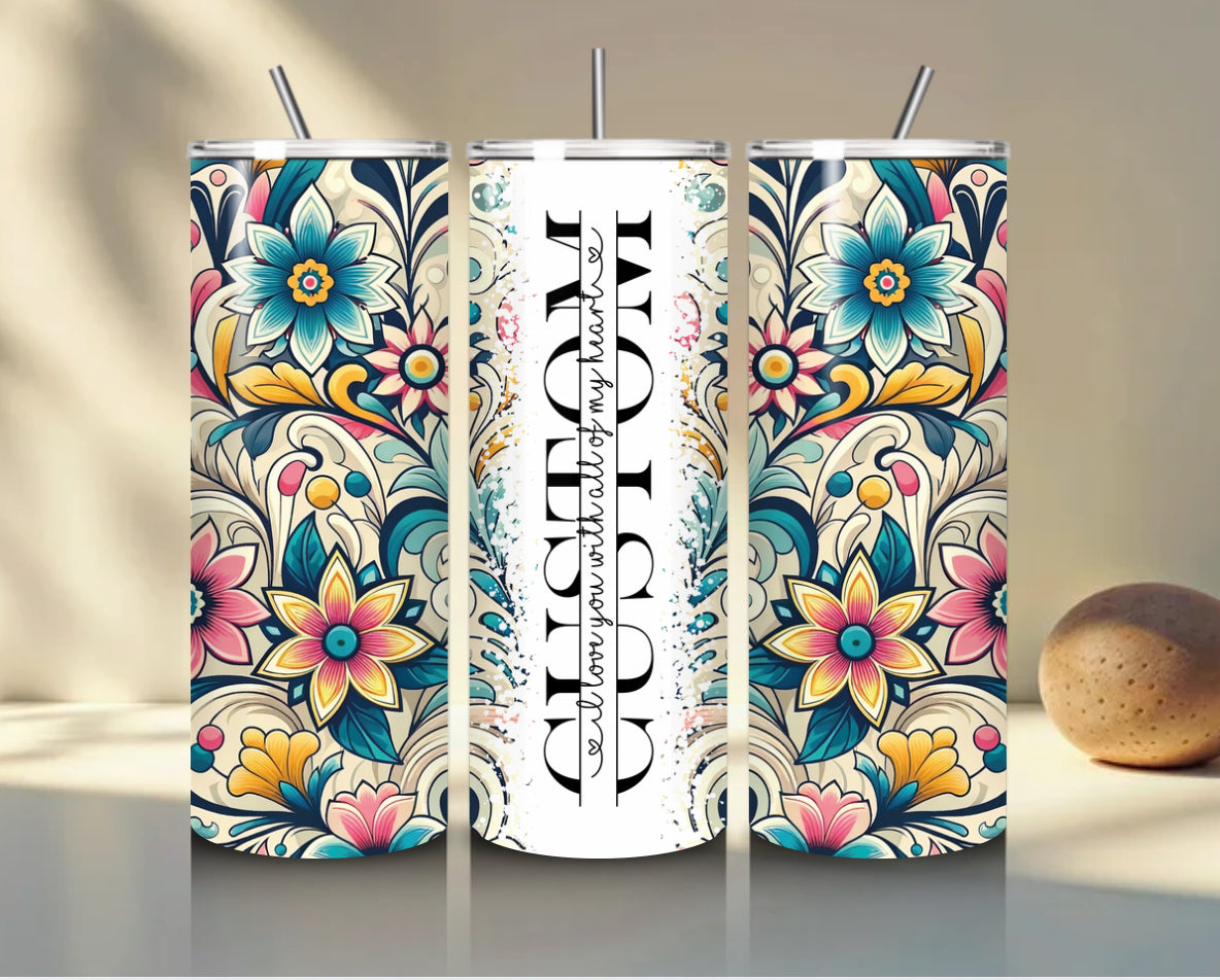 Colorful vintage floral sublimation tumbler with retro tones and a bold design. This 20oz tumbler is fully customised with your chosen name and centre text, made for everyday shine.