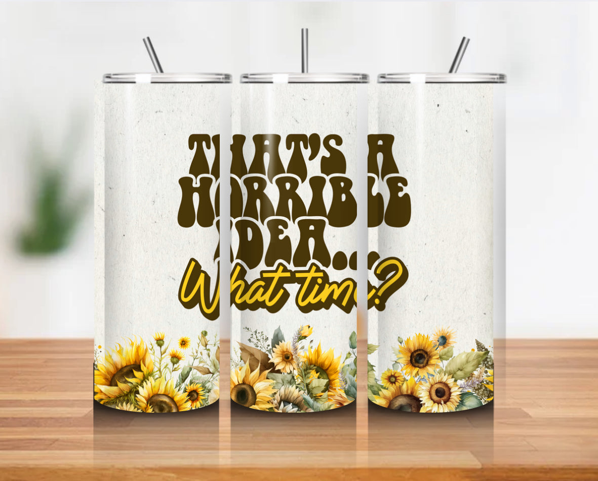 That’s a Horrible Idea… What Time? wrapped around a 20oz stainless steel cup with a clean, glossy finish.
